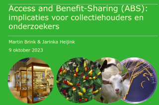 Presentatie 'Access and Benefit-Sharing (ABS): implicaties voor collectiehouders en onderzoekers' door Martin Brink en Jarinka Heijink (ABS Focal Point), 9 oktober 2023.