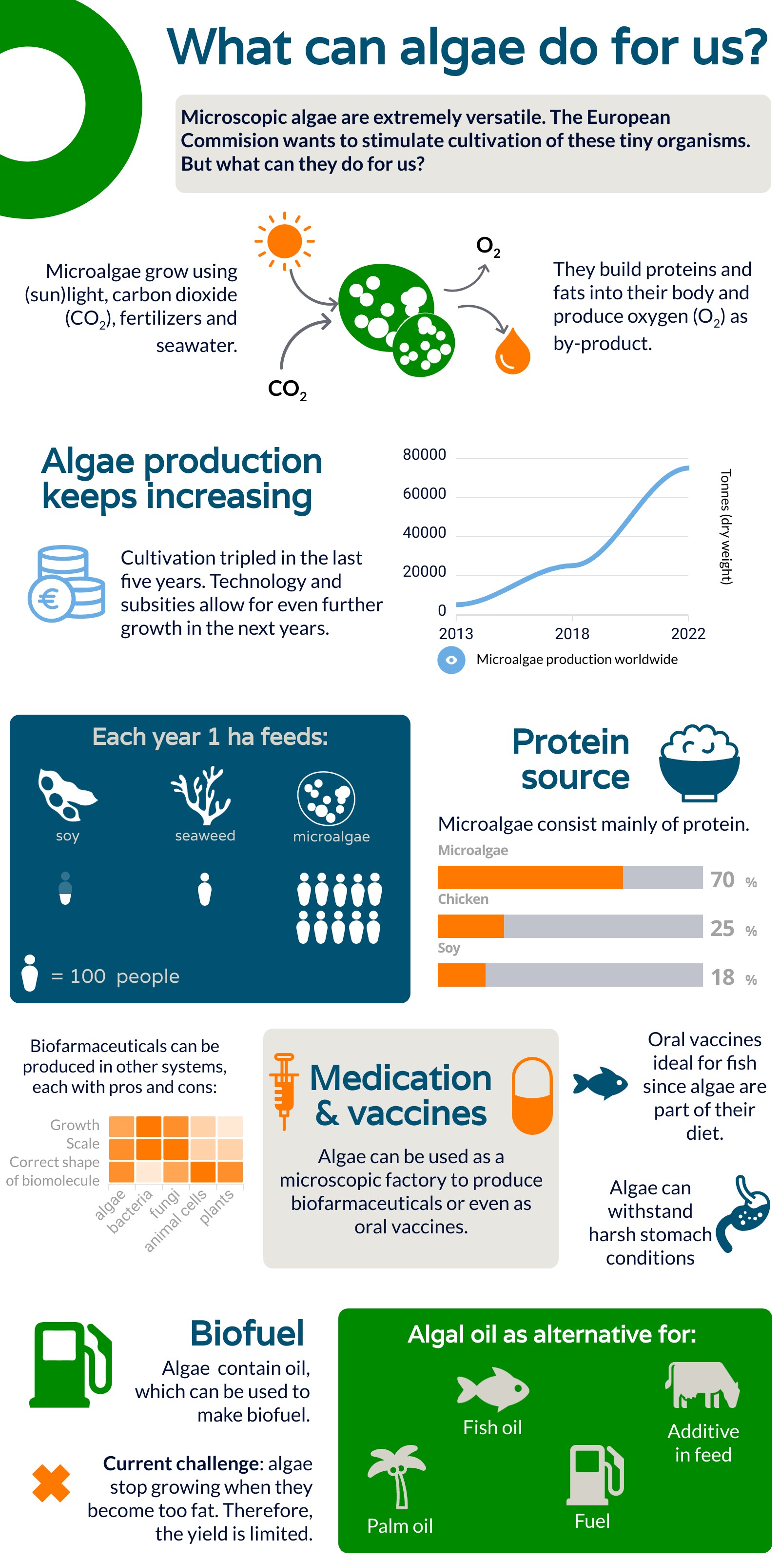 Through a complex network of pipes in Wageningen flow billions of algae: the green gold. These microscopic creatures are richly filled with fats and proteins, which makes them useful and versatile. What can they do for us?