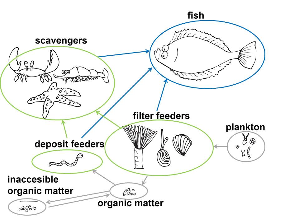 Based on their traits, the species within the food web were assigned to one of three groups. Animals that enjoy feeding on other animals (dead or alive), such as crabs and sea stars, are classified as scavenger/predators. A second group consists of for example bivalves and tube worms, characterized by filter feeding. These animals pump water through their bodies to collect food particles. Finally, there are the deposit feeders such as worms that feed on organic matter in and on the seabed. On top of that, fish that prey on each of these groups are included in the model. These groups are all affected to a certain extent by the various types of fishery, but also eat each other and compete with each other. These ecological interactions can complicate, or even reverse the net effect of fisheries on these groups.