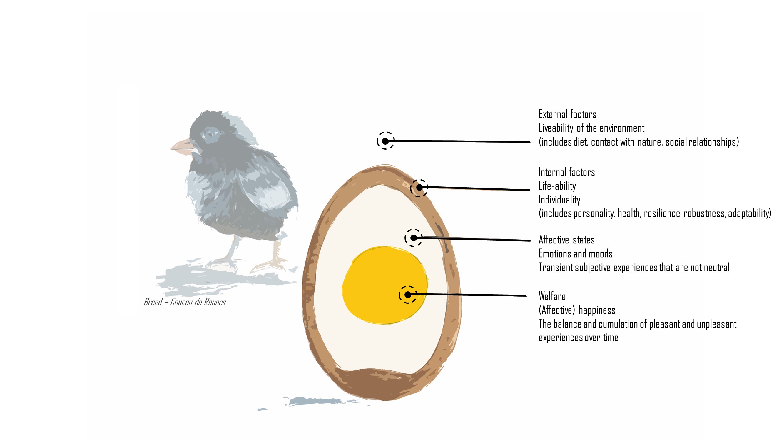 And while emotions and moods, or so called ‘affective states’, have often been thought of as synonymous with animal welfare, they are in the welfare egg (and elsewhere) more like ‘ingredients’ that feed into the overall welfare state. This welfare state is described as the balance between the frequency and cumulation of positive experiences and negative experiences, over a given period of time. In other words, if an animal has frequent positive experiences, and not too many negative experiences, this animal can be thought of as having good welfare. The same applies to people: the happiest people have frequent mild positive emotions.
