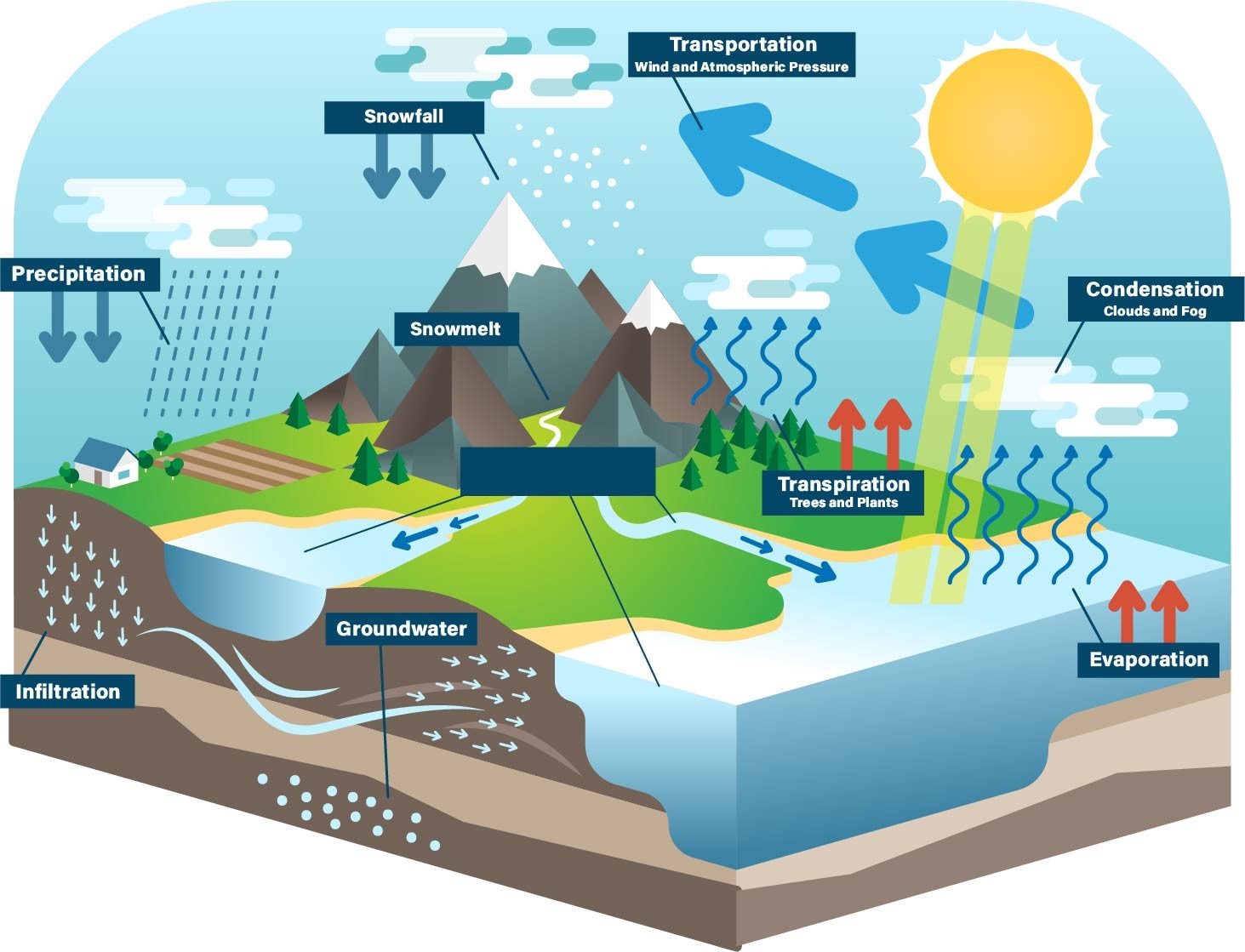 A schematic overview of the natural water cycle on Earth. It is clear that precipitation plays a crucial role in the water balance. In regions with little precipitation, groundwater is usually a reserve that was built up over thousands of years. If every year people take out more water than gets naturally replenished, this reserve will be exhausted. Source: VectorMine/Shutterstock.com