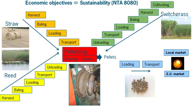 In Figure 1 the concept of using 3 types of herbaceous biomass (straw, reed and switchgrass) to secure a continuous biomass supply for production of pellets for the local and export markets is illustrated.