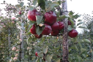 The orchard is part of the 'Apple Production Timeline' on Wageningen Campus. This timeline starts at the east-side of the campus with wild apple trees and ends at the Field with a modern orchard of small trees. Here you find the list with planted apple varieties.