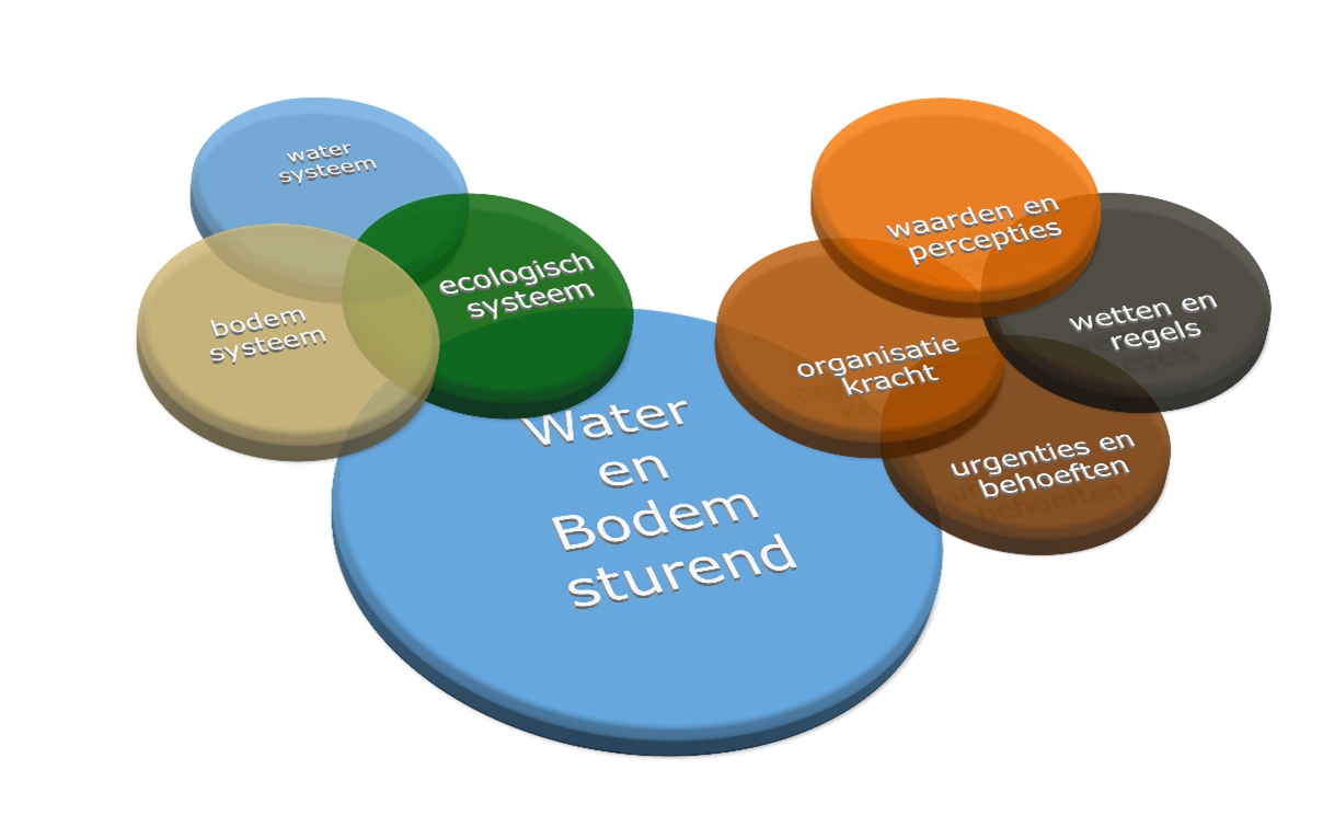 • Het bodem-watersysteem is een samengesteld geheel van verschillende onderdelen die elkaar beïnvloeden. Zodra je aan een ‘knop’ van het systeem draait, begint er vanzelf van alles mee te draaien. Daarom is het cruciaal dat we ons niet richten op losse onderdelen van het systeem, maar ‘water en bodem sturend’ in samenhang bekijken.