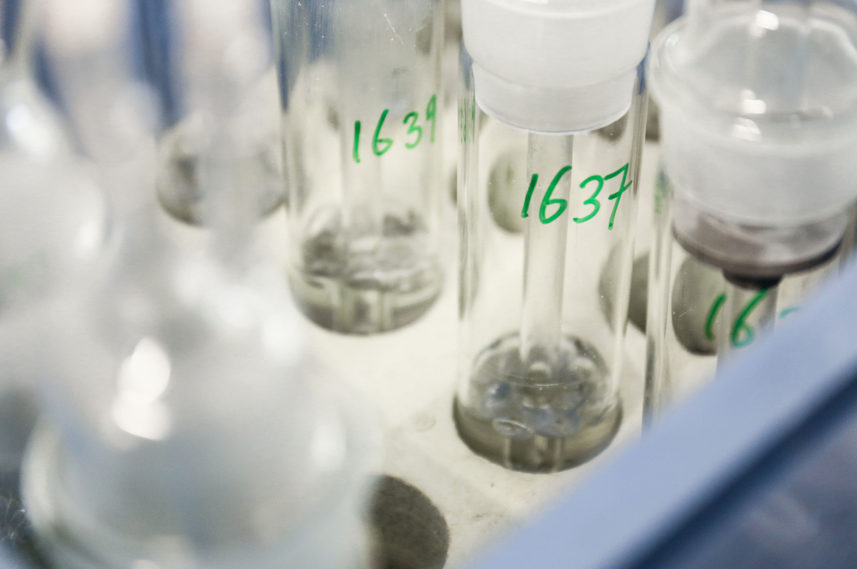Naast de sensor, meten de onderzoekers ammoniak door de stallucht door een flesje met een zure vloeistof te bubbelen. Dat zuur haalt de ammoniak uit de stallucht. In het laboratorium meten ze hoeveel ammoniak in de vloeistof zit. Doordat ze weten hoeveel liter stallucht ze ‘gebubbeld’ hebben, weten de onderzoekers dus ook hoeveel ammoniak in die stallucht zat.