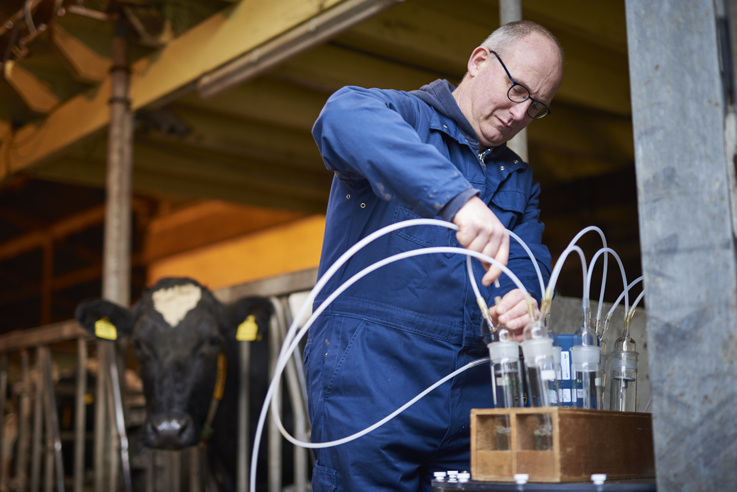 Beeld: Onderzoeker Hendrik Jan van Dooren sluit de flesjes aan waarmee ammoniak gemeten wordt.