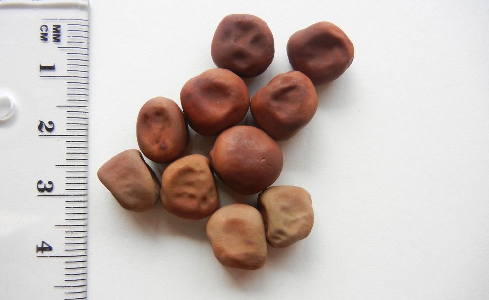 Zaadkleur en -vorm Grauwbruin met zwarte kiem, gedeukt