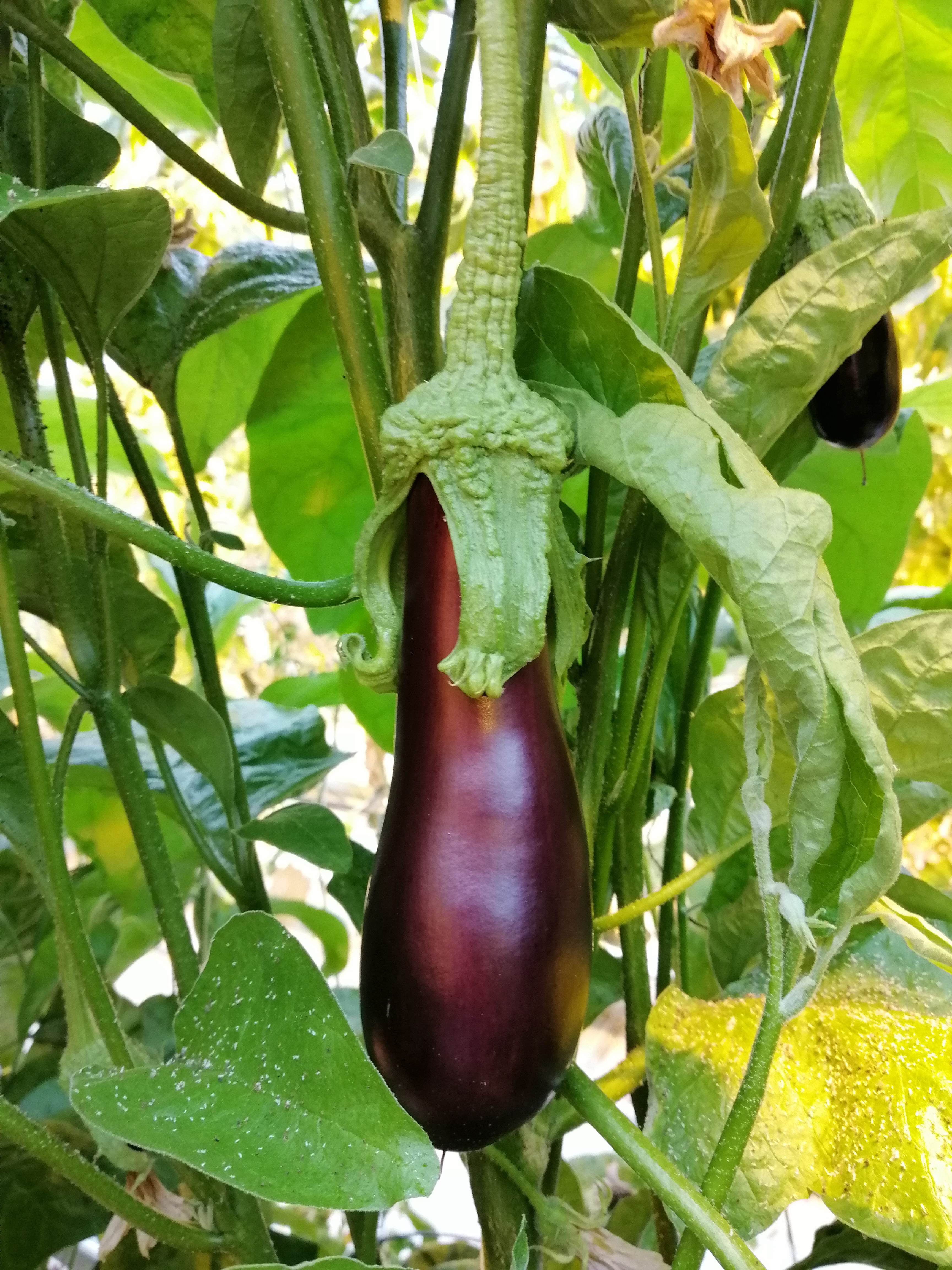 Aubergines worden in een onrijp stadium geconsumeerd; wanneer de vrucht de karakteristieke dieppaarse kleur heeft, zoals op de afbeeldingen. Voor zadenteelt laat je de vruchten wat langer hangen om te rijpen, waardoor ze een lichtbruine kleur krijgen en het vruchtvlees zacht wordt (op de afbeelding te zien voor erfgoedras Claresse).