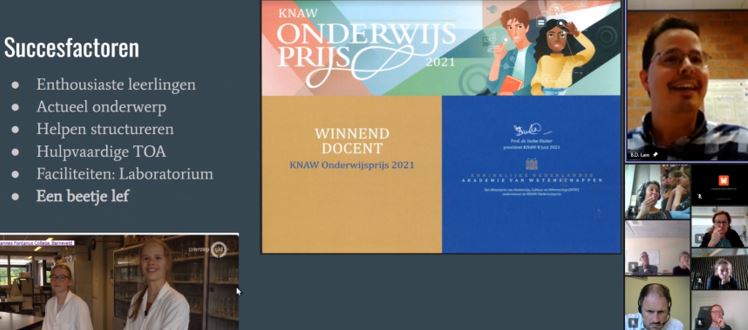 Daarna vervolgde Daniël Lam, docent scheikunde (Johannes Fontanus College), met het inspirerende verhaal over zijn leerlingen die met hun profielwerkstuk over antibioticaresistentie een studiebeurs hebben gewonnen. Het actuele onderwerp en het enthousiasme en lef van de leerlingen waren volgens Lam succesfactoren van dit geweldige resultaat.