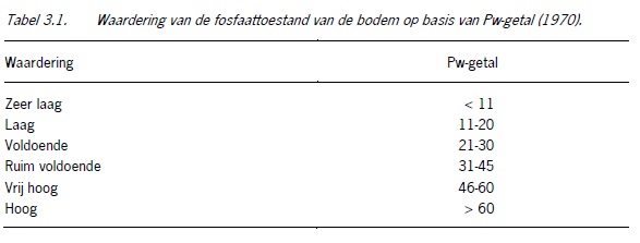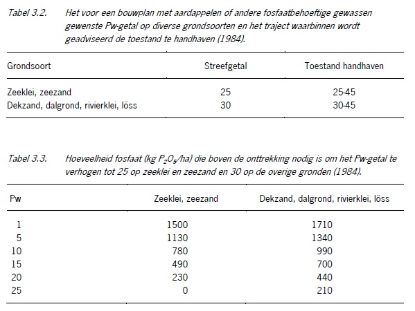 In Tabel 3.1 is de waardering van de fosfaattoestand van de bodem voor de akkerbouw weergegeven op basis van het Pw-getal. Deze waardering geldt voor alle grondsoorten. Bij het bodemgerichte advies wordt gestreefd naar de toestand voldoende. Op veeljarige proefvelden is gevonden dat bij gewassen als aardappelen en bieten bij een lage fosfaattoestand met een hoge fosfaatbemesting een lagere opbrengst wordt behaald dan bij een hogere fosfaattoestand met een lagere bemesting. Dit zal zeker ook gelden voor andere fosfaatbehoeftige gewassen. In Tabel 3.2 zijn streefgetallen voor de Pw vermeld waarbij dit nadelige opbrengsteffect niet meer optreedt. Deze streefgetallen gelden alleen voor bouwplannen met aardappelen en andere fosfaatbehoeftige gewassen. In andere gevallen kan worden uitgegaan van een Pw van 20. Naast streefgetallen zijn ook Pw-trajecten genoemd waarbinnen wordt geadviseerd de toestand te handhaven (Tabel 3.2).