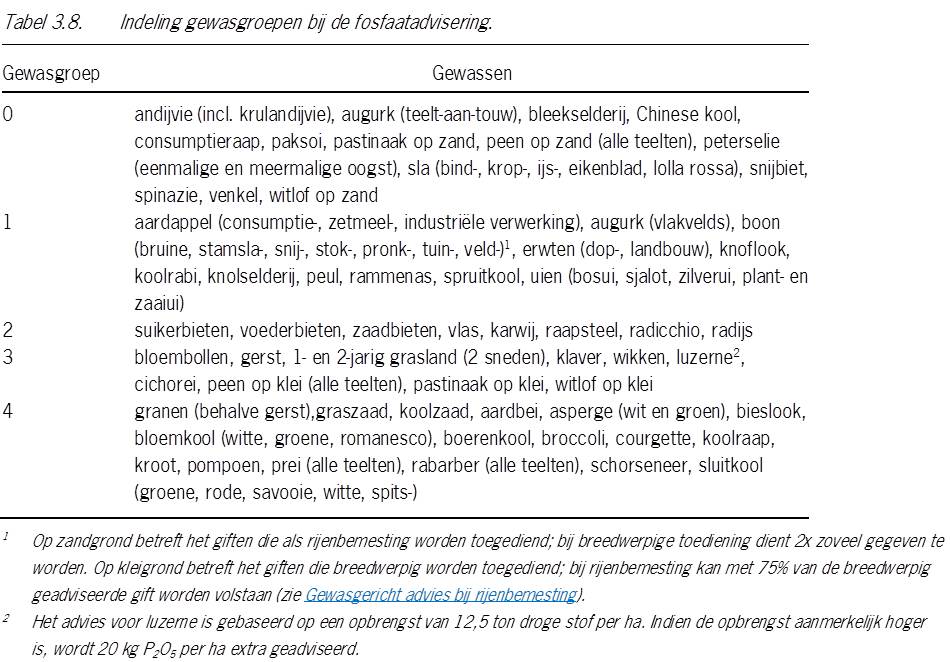 De gewassen zijn ingedeeld in 5 gewasgroepen, afnemend in fosfaatbehoefte. Aanvankelijk was er een indeling in 4 groepen voor het akkerbouwadvies. Na integratie van het vollegrondsgroenten- met het akkerbouwadvies is een extra gewasgroep (0) toegevoegd aan de bestaande groepen 1 t/m 4. De indeling in gewasgroepen is weergegeven in Tabel 3.8.