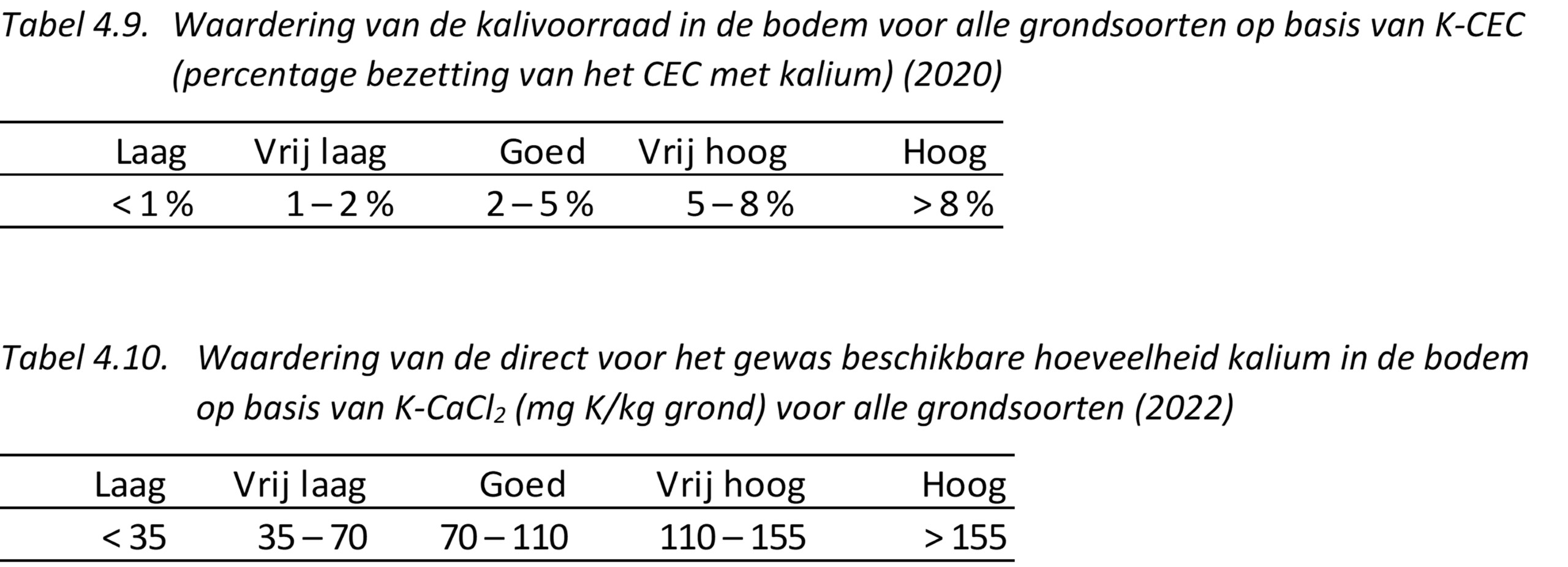 Aan de hand van de combinatie van K-CaCl2, CEC en K‑CEC worden de gewasadviesgiften kali bepaald. De waardering van de kalitoestand van de bodem voor de akkerbouw vindt plaats op basis van K-CaCl2 en K‑CEC. Dit is weergegeven in de tabellen 4.9 en 4.10.