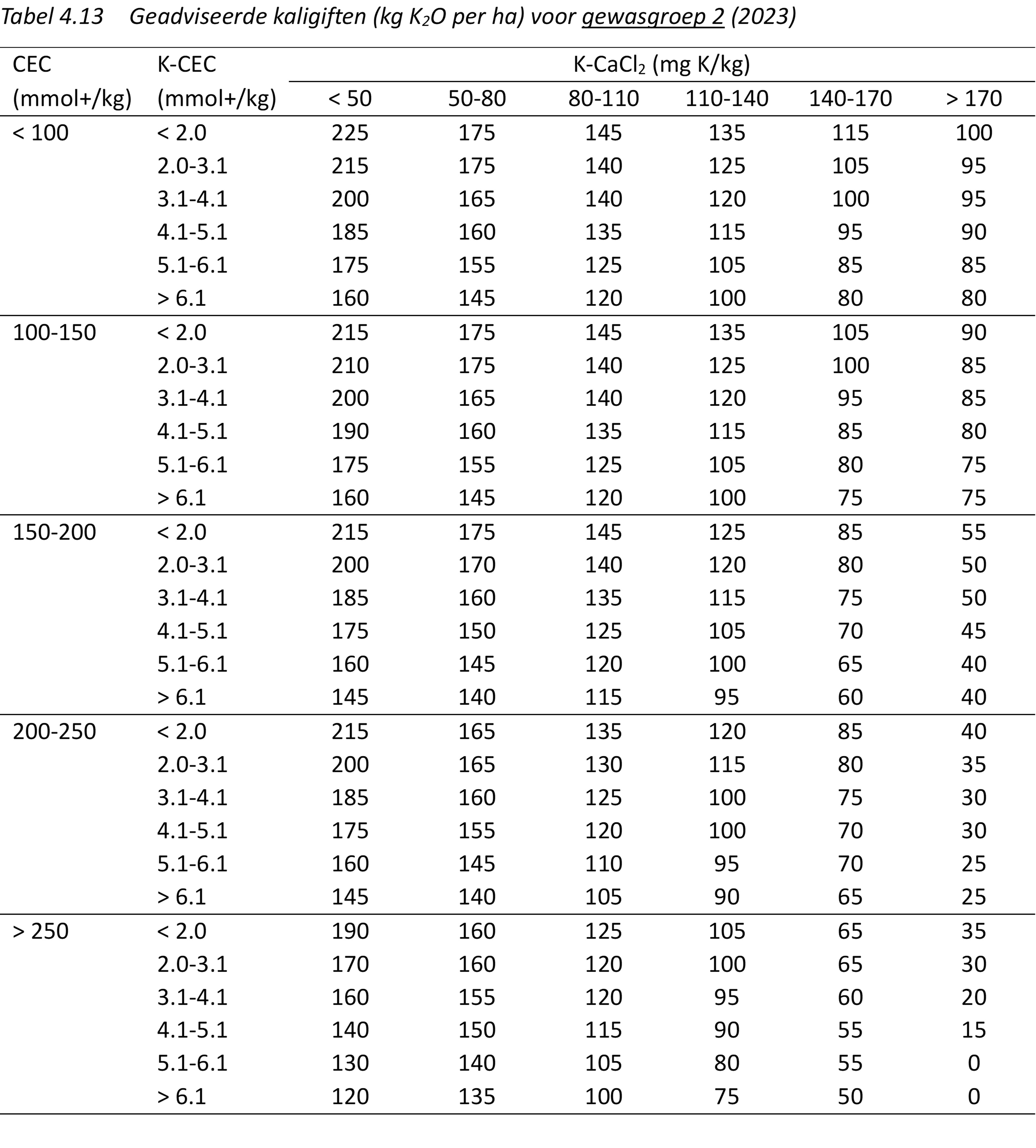 In de tabellen 4.12 t/m 4.15 worden de gewasadviesgiften kali vermeld, afhankelijk van de kalitoestand van de bodem op basis van K-CaCl2, CEC en K‑CEC. De gewassen zijn ingedeeld naar kalibehoefte in vijf gewasgroepen. De indeling in gewasgroepen is weergegeven in tabel 4.11.