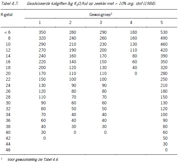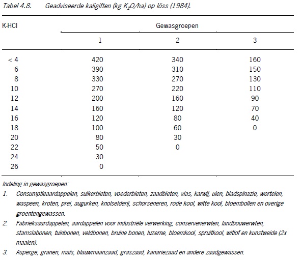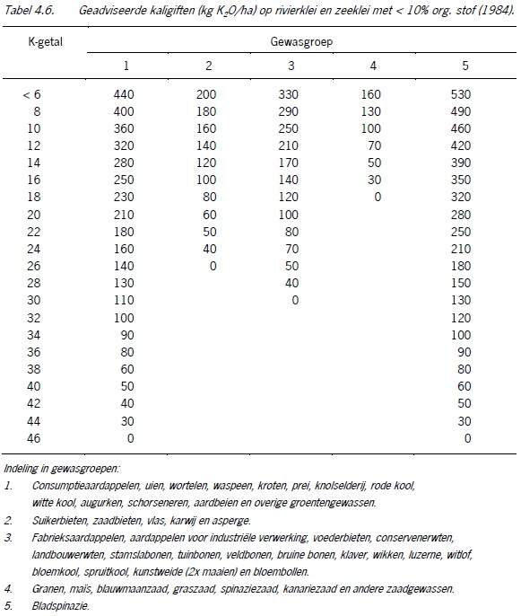 In Tabel 4.5 t/m 4.8 worden de kaligiften vermeld die nodig zijn om gegeven de kalitoestand de economisch optimale opbrengst te bereiken. De gewassen zijn ingedeeld in gewasgroepen. De indeling staat onder de adviestabellen vermeld.