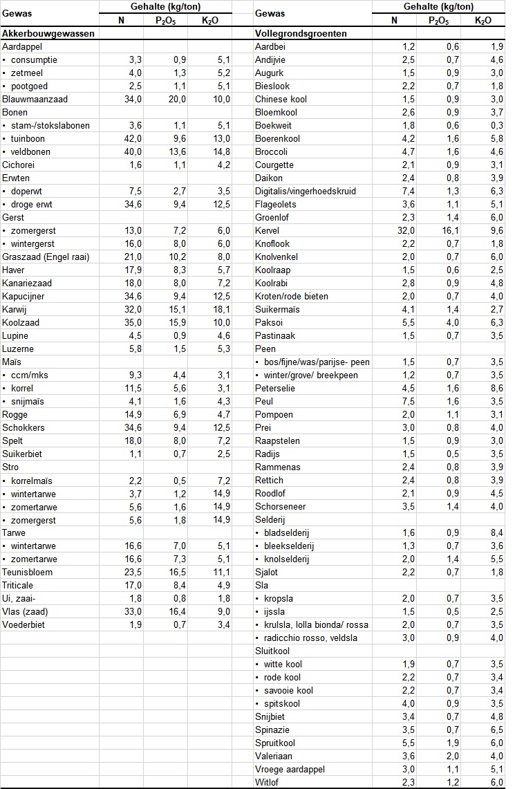 - De Ruijter, F.J., W. van Dijk, W.C.A. van Geel, G. Holshof, R. Postma & P. Wilting (2020). Actualisatie van stikstof- en fosfaatgehalten van akkerbouwgewassen met een groot areaal. Wageningen Research Rapport WPR 957, 96 pp.