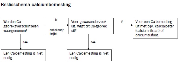Als het Ca-gehalte in het gewas lager is dan het kritische gehalte, kan een bodem- of bladbemesting met een Ca-houdende meststof worden overwogen. Deze kan worden uitgevoerd in combinatie met een ander element dat men toch al toe wilde dienen, bijvoorbeeld samen met stikstof in de vorm van kalksalpeter (calciumnitraat).