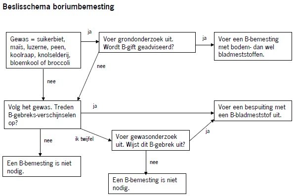 Suikerbieten vormen een uitzondering. Van dit gewas is op basis van bladanalyses bekend beneden welk gehalte de kans op boriumgebrek groot is. Dit is bij een gehalte lager dan 3,2 mg B per 100 gram droge stof.