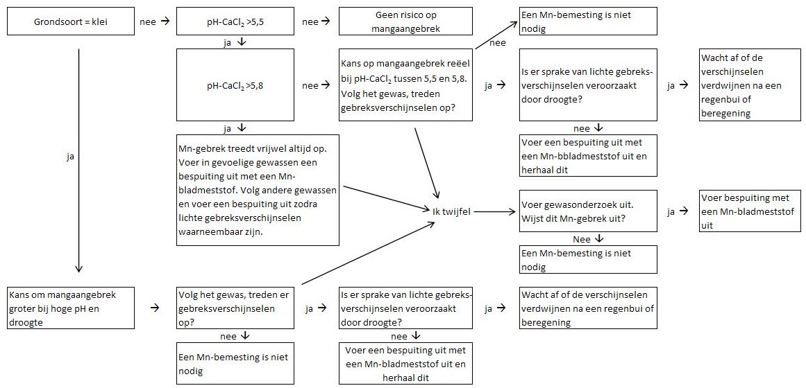 Voor zand- en dalgrond geldt dat bij pH-CaCl2 < 5,5 er geen gevaar bestaat voor mangaangebrek. Bij een pH-CaCl2 > 5,5 neemt de kans op mangaangebrek toe en bij een pH-CaCl2 > 6,3 treedt vrijwel altijd mangaangebrek op. Indien mangaangebrek optreedt, wordt geadviseerd een mangaanbespuiting uit te voeren.