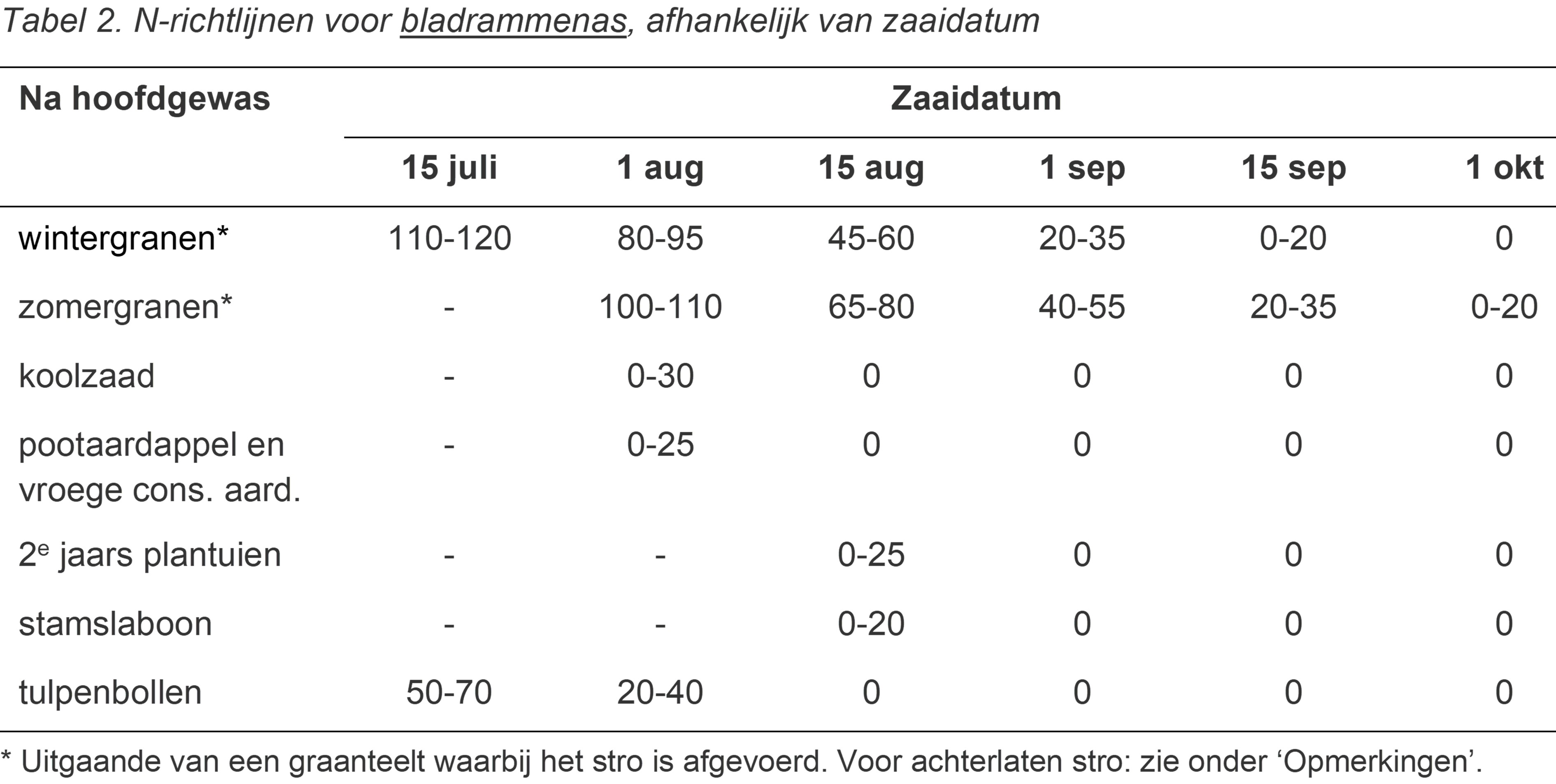 Er is voor bladrammenas over het algemeen geen N-gift nodig na zaaiuien, doperwt, bruine boon, zomerveldboon, droge erwt, spinazie, ijssla.