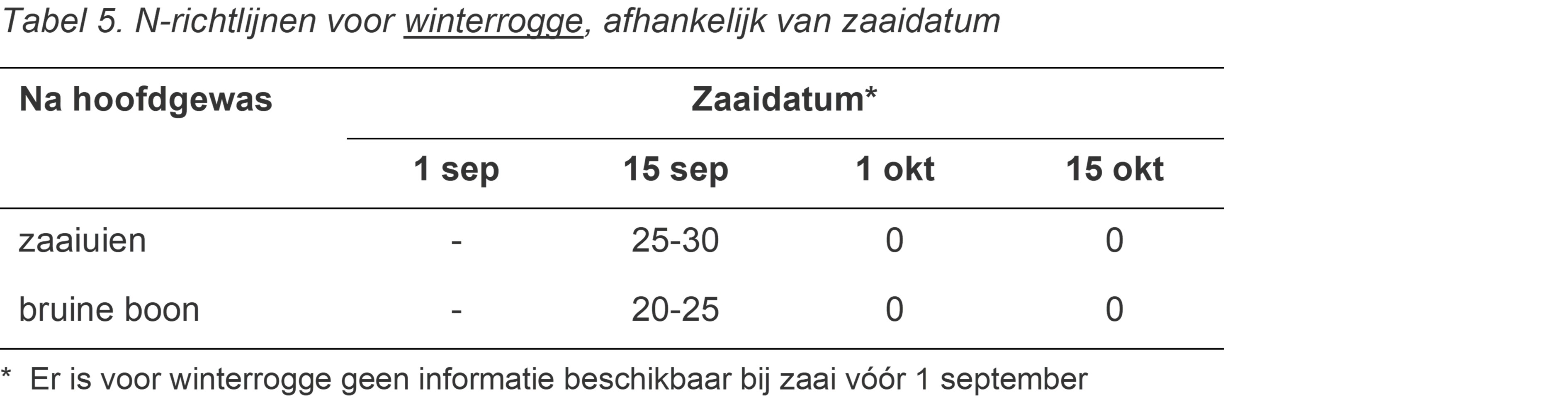 Er is voor winterrogge geen informatie beschikbaar over de N-behoefte in relatie tot voorvrucht bij zaai vóór 1 september. Bij zaai vanaf 1 september is er voor winterrogge over het algemeen geen N-gift nodig na koolzaad, pootaardappel, vroege consumptieaardappel, tulpenbollen, plantuien, doperwt, stamslaboon, zomerveldboon, droge erwt, spinazie, ijssla.