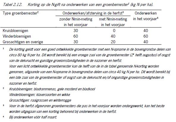 In Tabel 2.12 staat weergegeven hoeveel kan worden gekort op de N-gift wanneer groenbemesters zijn ondergewerkt.