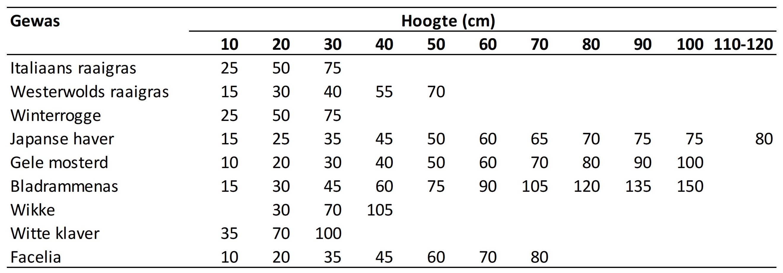 2. De bovengrondse N-opname van een groenbemester kan bij een aantal soorten ook worden geschat op basis van de lengte van het gewas. Hierbij kunnen de volgende relaties worden gehanteerd: