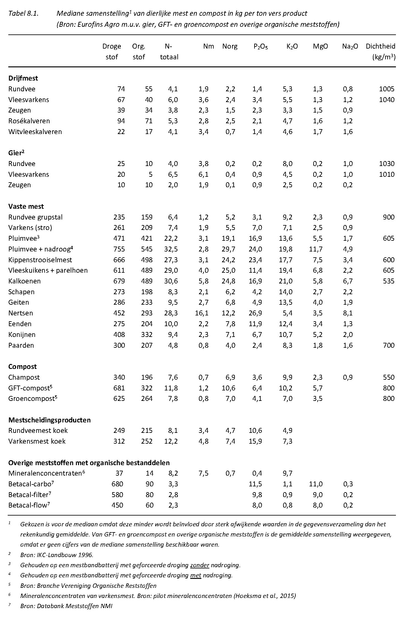 In Tabel 8.1 is de mediane of de gemiddelde samenstelling van verschillende soorten organische mest weergegeven. Hierbij moeten de volgende opmerkingen worden gemaakt: