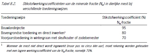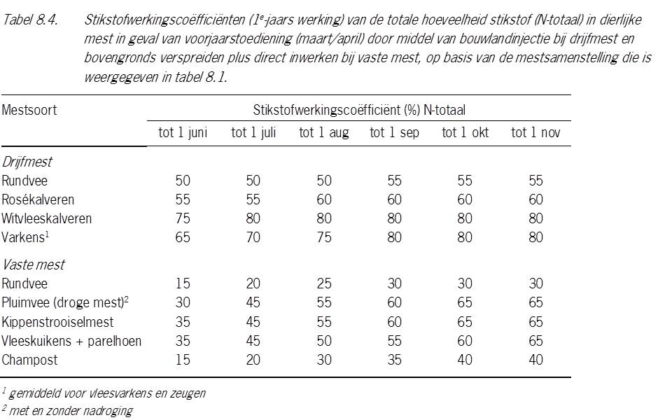De stikstofwerkingscoëfficiënt van de Nm-fractie is afhankelijk van de toedieningsmethode (Tabel 8.2). De stikstofwerkingscoëfficiënt van de Norg-fractie is afhankelijk van de mestsoort, het toedieningstijdstip en de stikstofopnameperiode van het gewas. In Tabel 8.3 is de stikstofwerkingscoëfficiënt van de Norg-fractie van verschillende mestsoorten weergegeven bij voorjaarstoepassing. In Tabel 8.4 is de stikstofwerkingscoëfficiënt van N-totaal in de mest weergeven bij voorjaarstoepassing op basis van de mestsamenstelling die is weergegeven in Tabel 8.1.