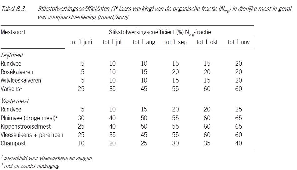 3. In geval van dubbelteelten komt bij voorjaarsaanwending van mest het werkzaam deel van de minerale stikstof en een deel van de organische gebonden stikstof beschikbaar aan de 1e teelt. In de 2e teelt komt enkel een deel van de organische fractie beschikbaar. De stikstofwerking tussen twee opeenvolgende data kan worden geschat met behulp van Tabel 8.3 (voor Norg) of Tabel 8.4 (voor N-totaal). Voorbeeld: bij voorjaartoediening van champost komt in de periode tussen 1 augustus en 1 oktober 10% van N-totaal beschikbaar.