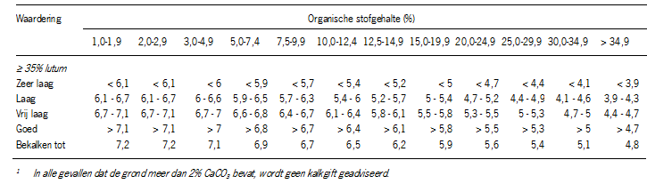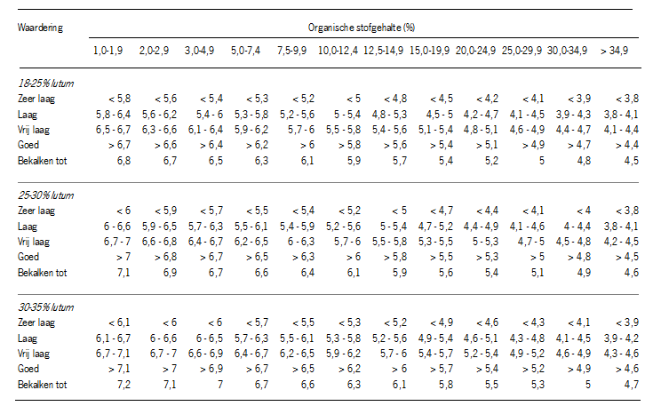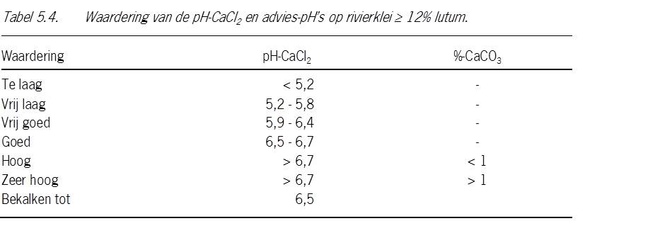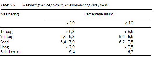 In Tabel 5.3 t/m 5.6 staan de advies-pH’s en de waarderingsklassen weergegeven voor resp. zeeklei, zeezand, rivierklei en löss.