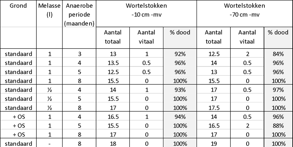 In de container zonder substraat toevoeging werden na acht maanden ook geen vitale wortelstokfragmenten meer aangetroffen. Blijkbaar leidt de toevoeging van substraat tot een snellere zuurstofloosheid maar niet tot een kortere behandelingsduur. Met andere woorden, toevoeging van substraat maakt de methode niet effectiever.