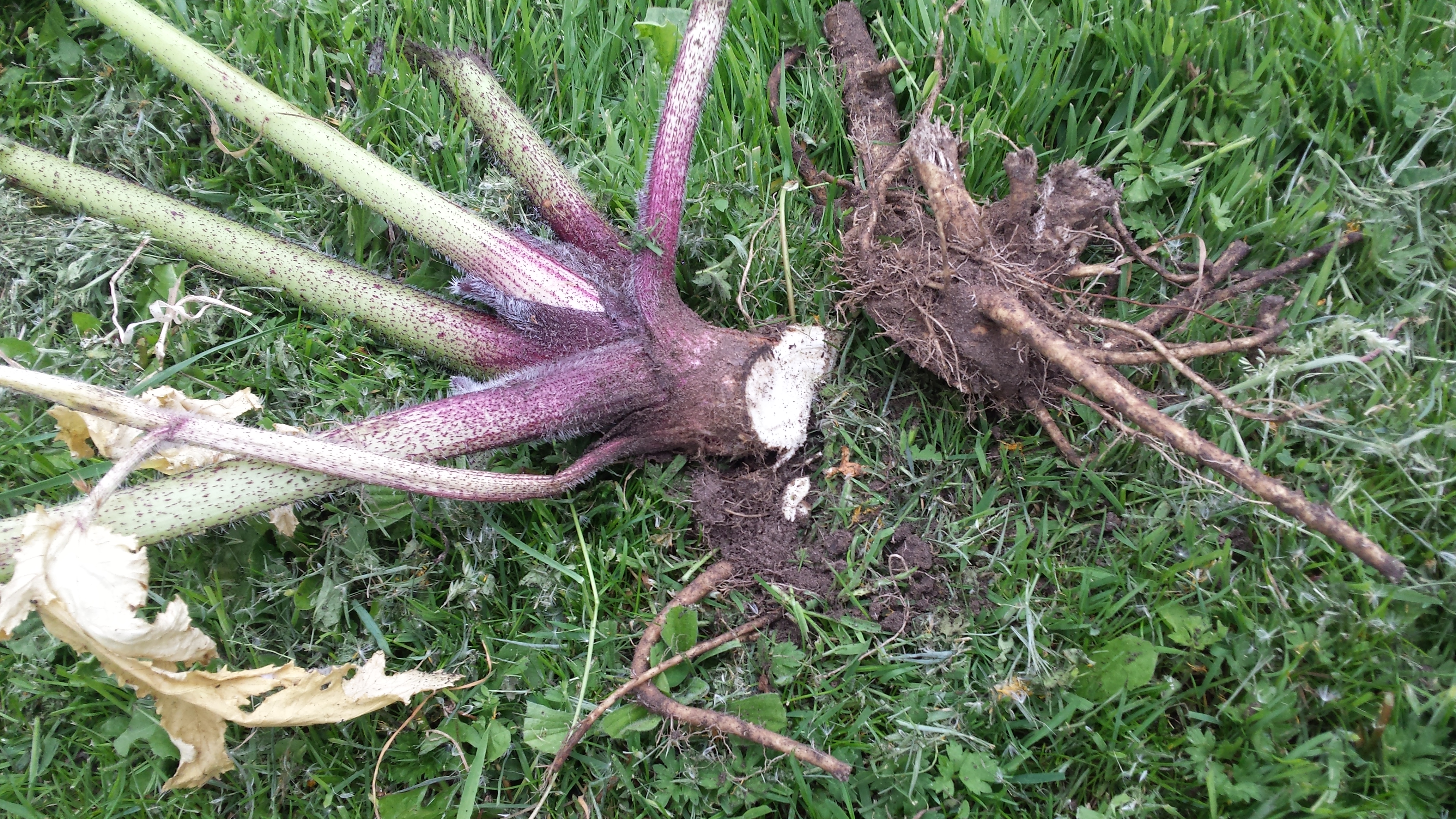 - Het grootste gedeelte van de plant zit direct onder de stengels. Dit is vaak een houtige klomp. Leg de vrijgekomen wortels niet in de tuin maar stop dit gelijk in de restafvalcontainer, vuilniszak of kruiwagen.
