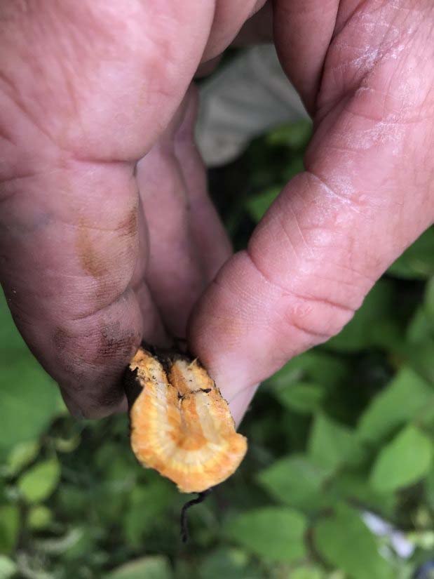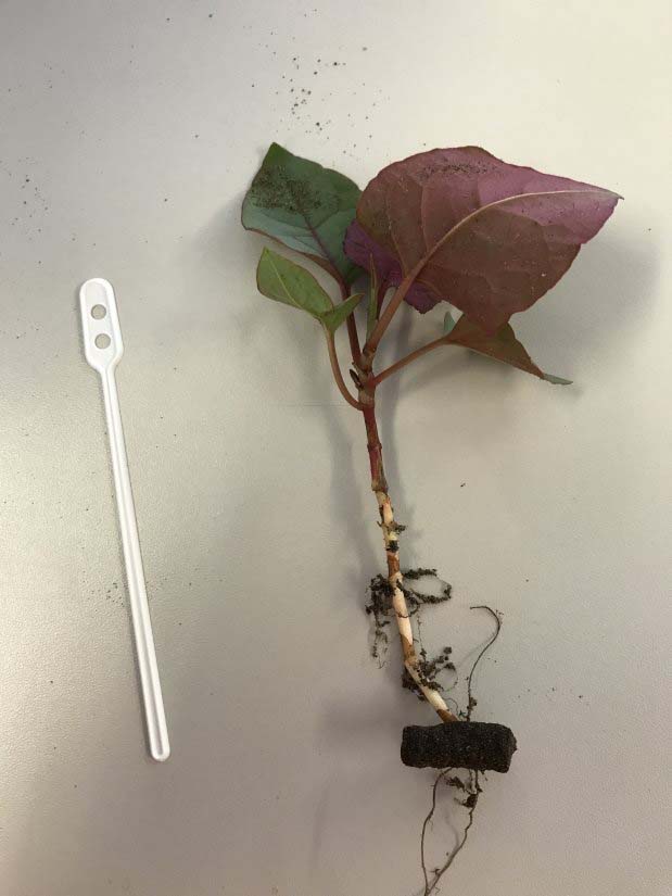 - Kijk goed of er in de randen van het gat nog wortels zichtbaar zijn. De wortels van de duizendknoop zijn van binnen oranje en hebben vaak een ring (8 FOTO). De uitlopers zijn helemaal wit met lichtbruine ringen.